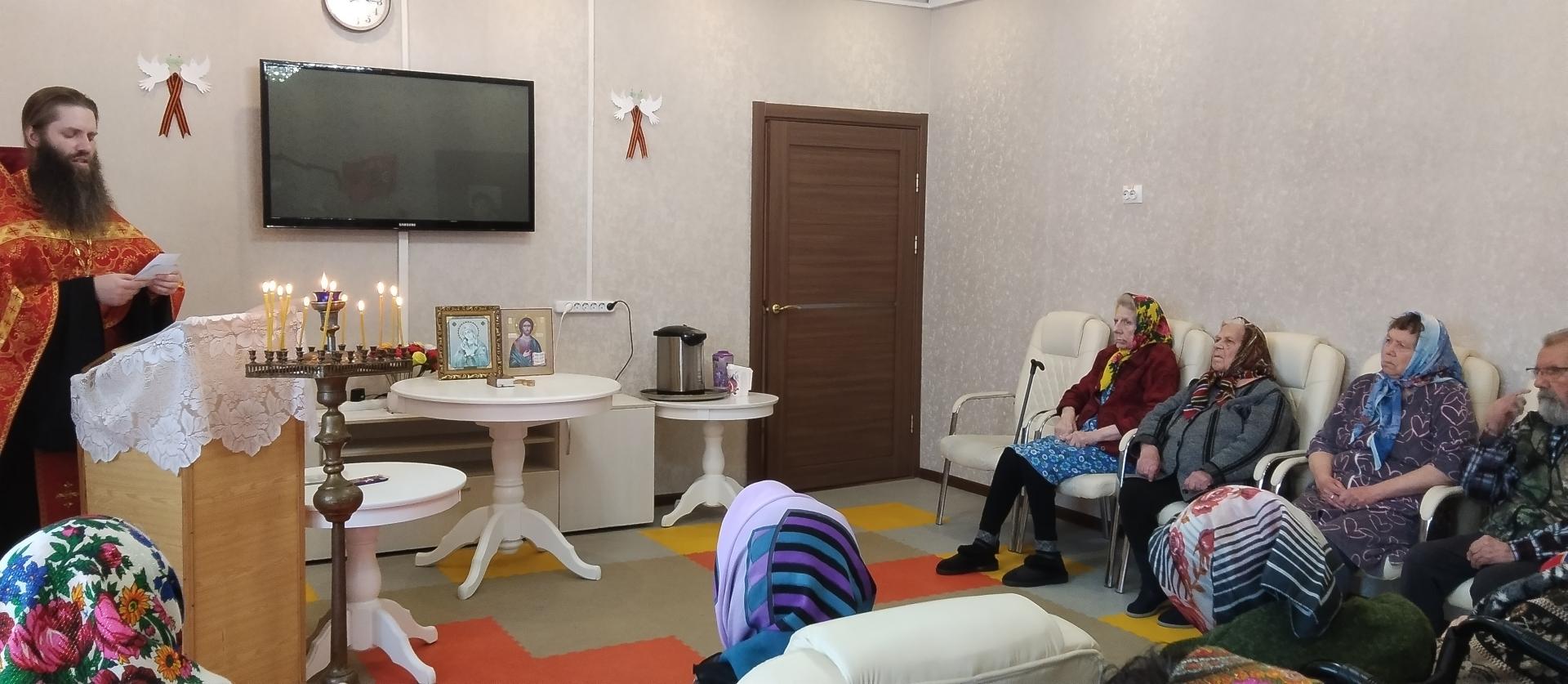 Отдавая дань памяти погибшим в годы войны и умершим в послевоенное время, получатели социальных услуг отделения милосердия приняли участие в благодарственном молебне Господу Богу за дарование победы в Великой Отечественной войне, которую отслужил служащий священник Свято-Знаменского женского монастыря города Гороховца иерей Алексей Войнов.