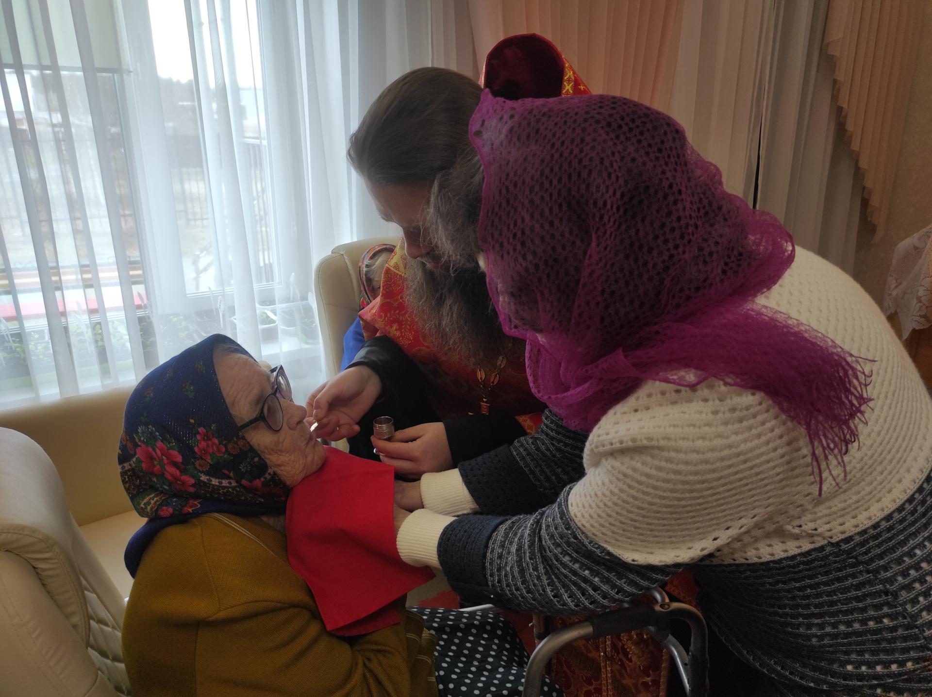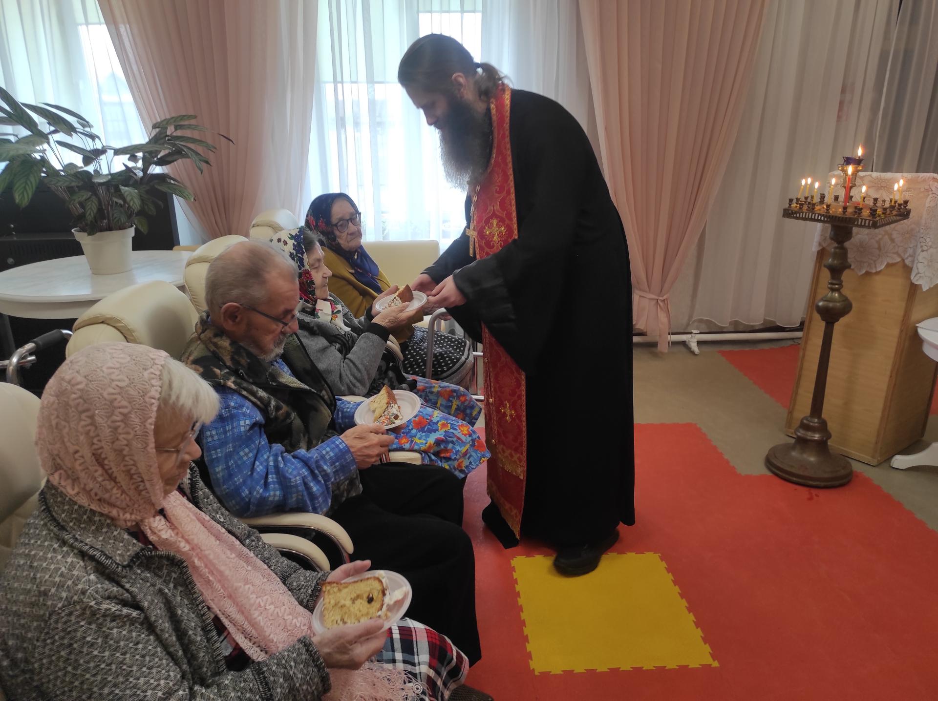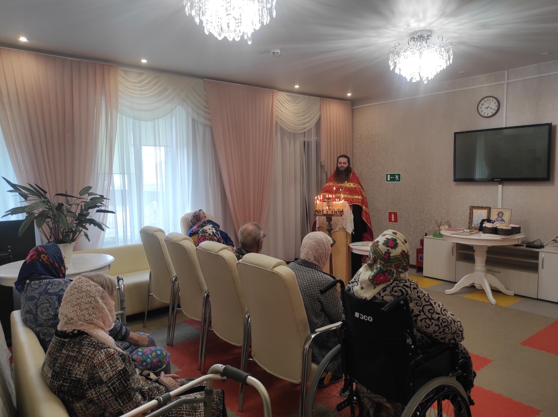 Батюшка совершил праздничный молебен, зачитал поздравительное послание Святейшего Патриарха Московского и всея Руси Кирилла, исповедал и причастил всех желающих. Не остались без внимания и те, кто по состоянию здоровья не смог присутствовать на общей молитве: Таинства Исповеди и Причастия священник совершил непосредственно в комнатах проживающих.
